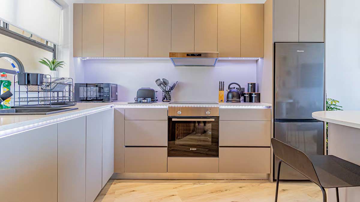 The kitchen offers modern brand new appliances, including dishwasher, fridge freezer, microwave, washing machine.