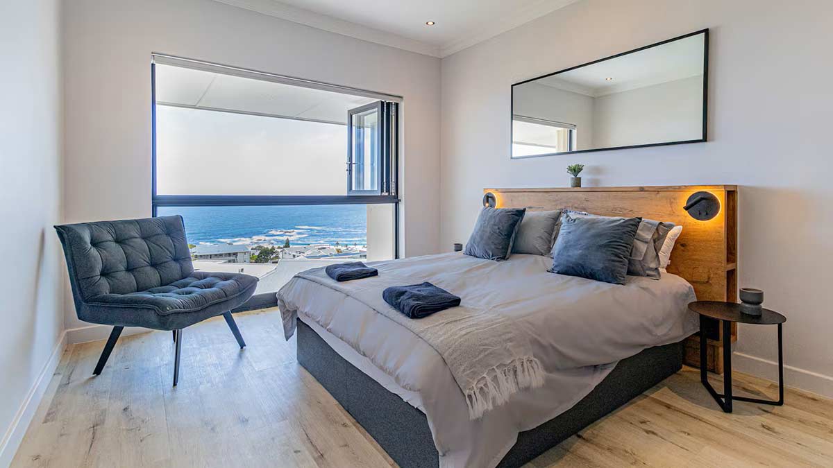 Master bedroom has an incredible view of the ocean, with bi folding windows that open right across to enjoy the magnificent view. It has a Queen size bed with ample wardrobe space.